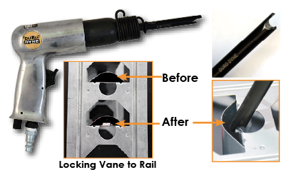 The Vane Locking Tool provides a fast and reliable way to secure vane to the rail. The extended end gets inserted into the round opening on the rail and with the simple pull of the trigger the vane is secured to the rail and will stay secure during transit, install or anything it comes in contact with making installation a breeze.