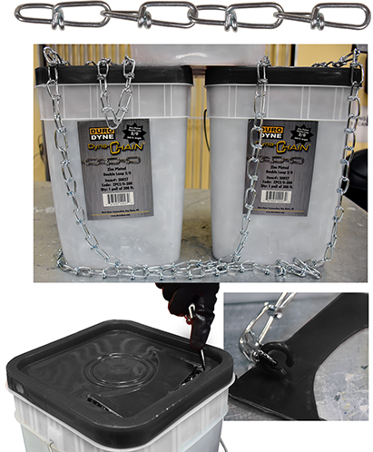 It is sold in a convenient bucket to make use on the job site easier with a pre-scored top and built in loop to keep track of the end of the chain.