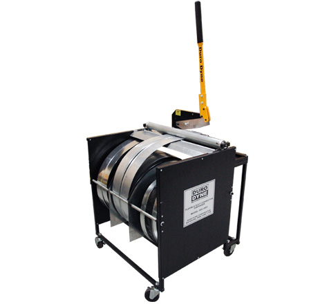 The Duro Dyne Connector Dispenser can relieve many of the difficulties associated with the handling of flexible connector. Duro Dyne’s Model FDC-AB3 features straightening rollers to combat connector coil set. The FDC-AB3 keeps up to three rolls of flexible duct connector or vane rail within easy reach, anywhere in the shop. Full swivel casters make movement around the shop possible, and ball bearing rollers quickly dispense connector with a simple pull. A foot actuated brake locks the FDC-AB3 in place when dispensing the connector. The shear attachment cuts the duct connector accurately and effortlessly.