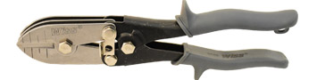 An ideal tool for joining sheet metal pipes of the same size. The pipes can be corrugated, round or square. It is great for repairs in the field. It has a matte black finish with red plastisol grips. It is a compound action tool for crimping up to 22 and 24 gage.